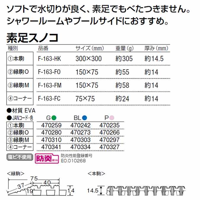 ●材質:EVA ●サイズ:300×300mm ●重量:約305g ●厚み:14.5mm ※置き敷きの場合、縁駒を付けることで、より安全に使用できます。