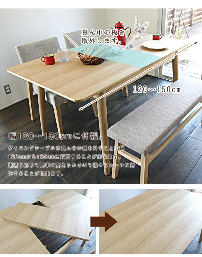 ダイニングテーブルは真ん中の板を外すことで幅120cmから150cmに変更することが出来ます。